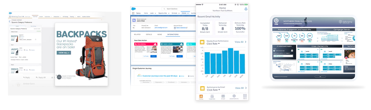 Med Marketing Cloud-lösningen kan du skapa personliga relationer genom alla kanaler och i mobilitet: e-post, webb, sociala nätverk, anslutna objekt... Organisera, följ dina kampanjer och utnyttja all data som samlas in under interaktioner med kunder för att erbjuda dem mer riktat innehåll , personliga och i linje med deras behov.